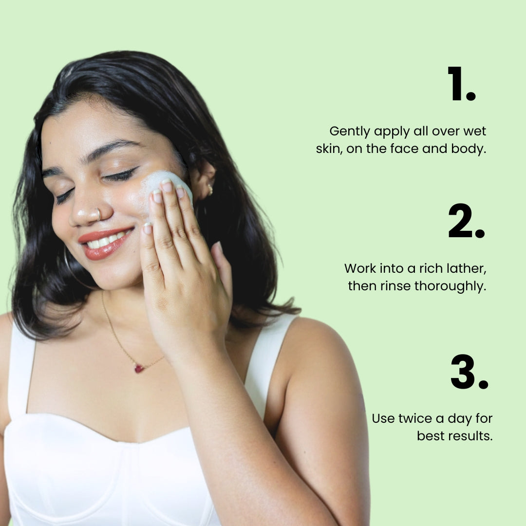 Use a pea-sized amount for the face and a little extra for the body. Gently lather and rinse to keep your skin clean and balanced without over-drying.